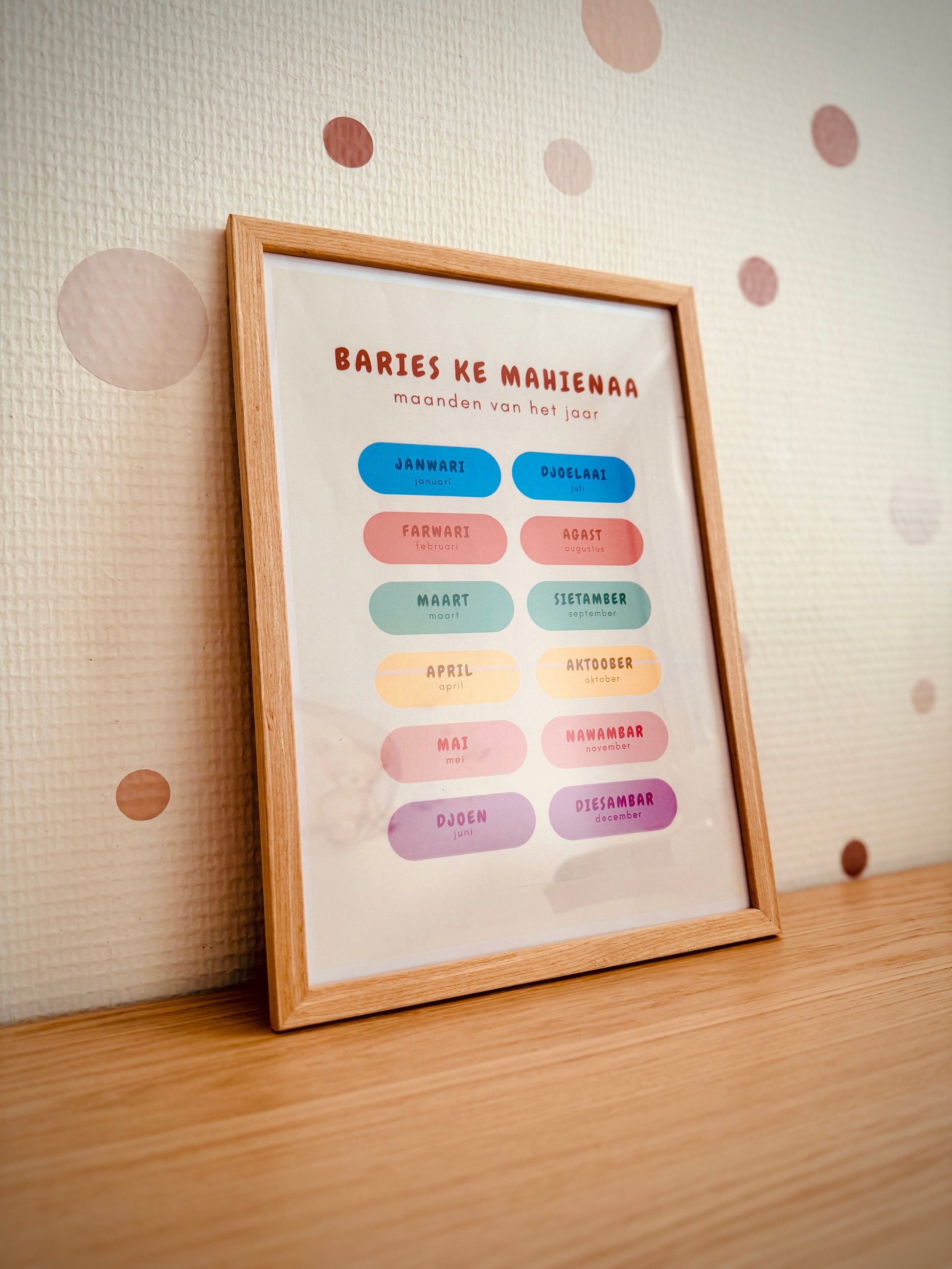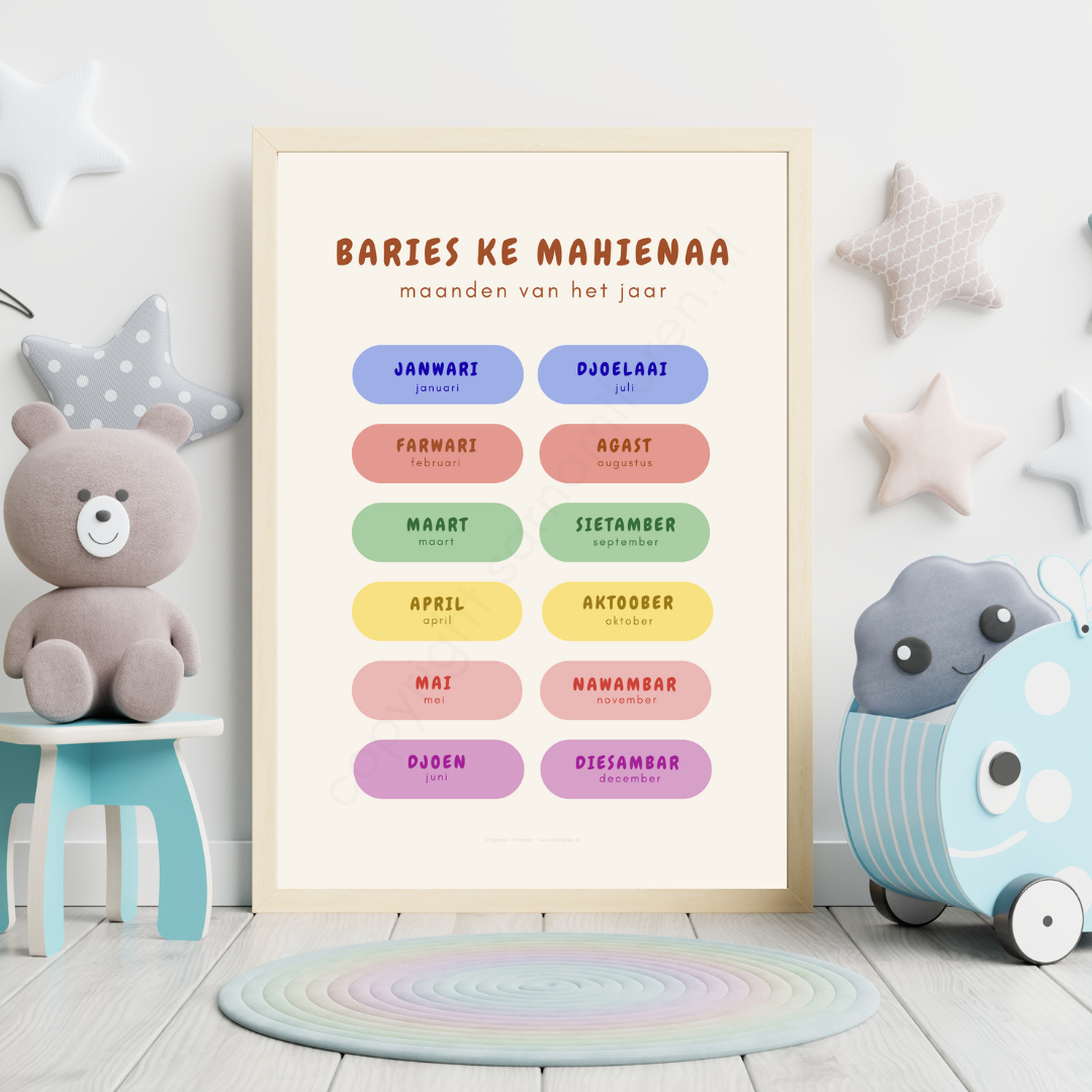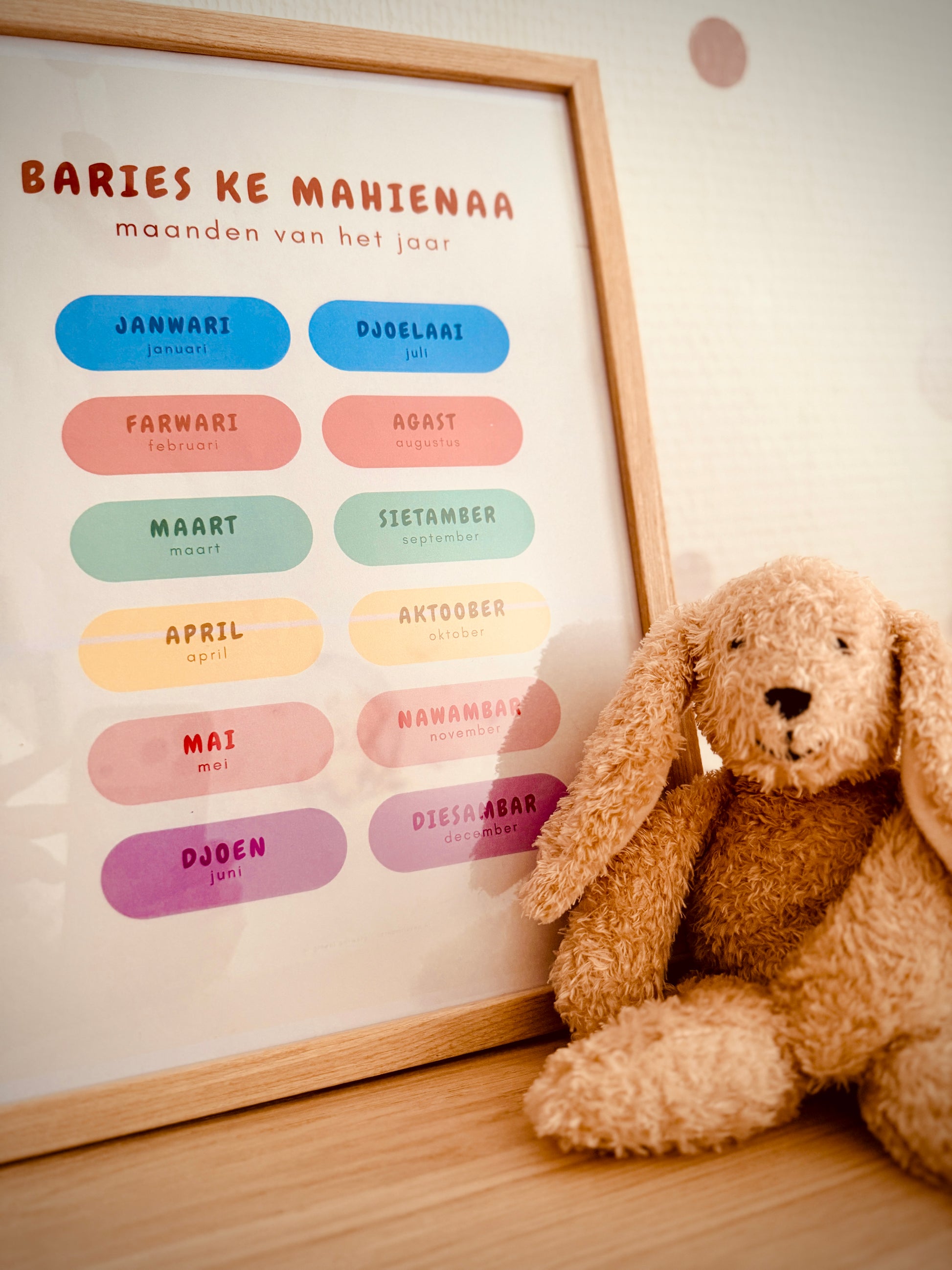 Ontdek de maanden van het jaar met onze A3 educatieve poster Maanden van het jaar - Baries ke Mahienaa! Deze kleurrijke poster laat alle 12 maanden overzichtelijk zien, met de namen in Sarnami en Nederlands.