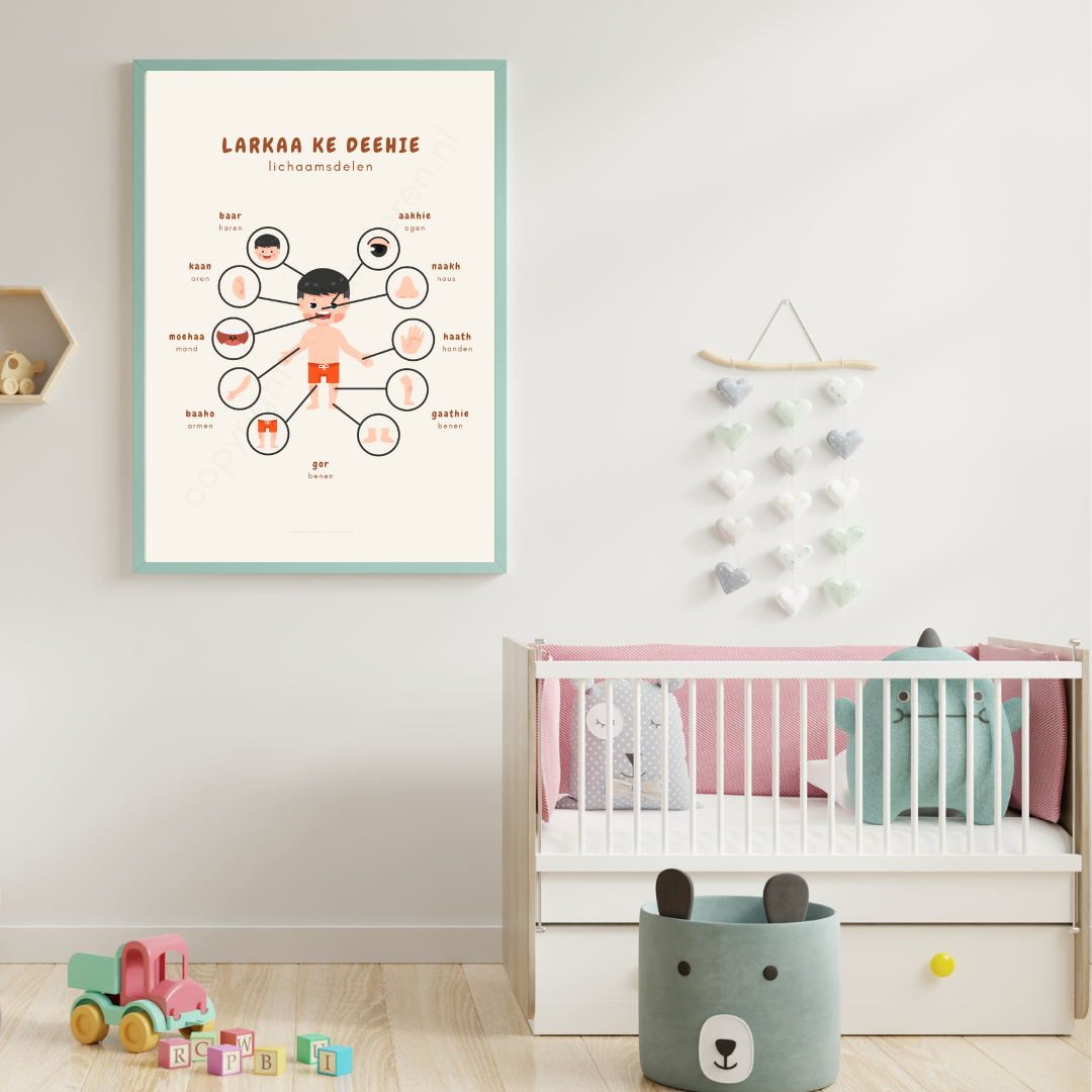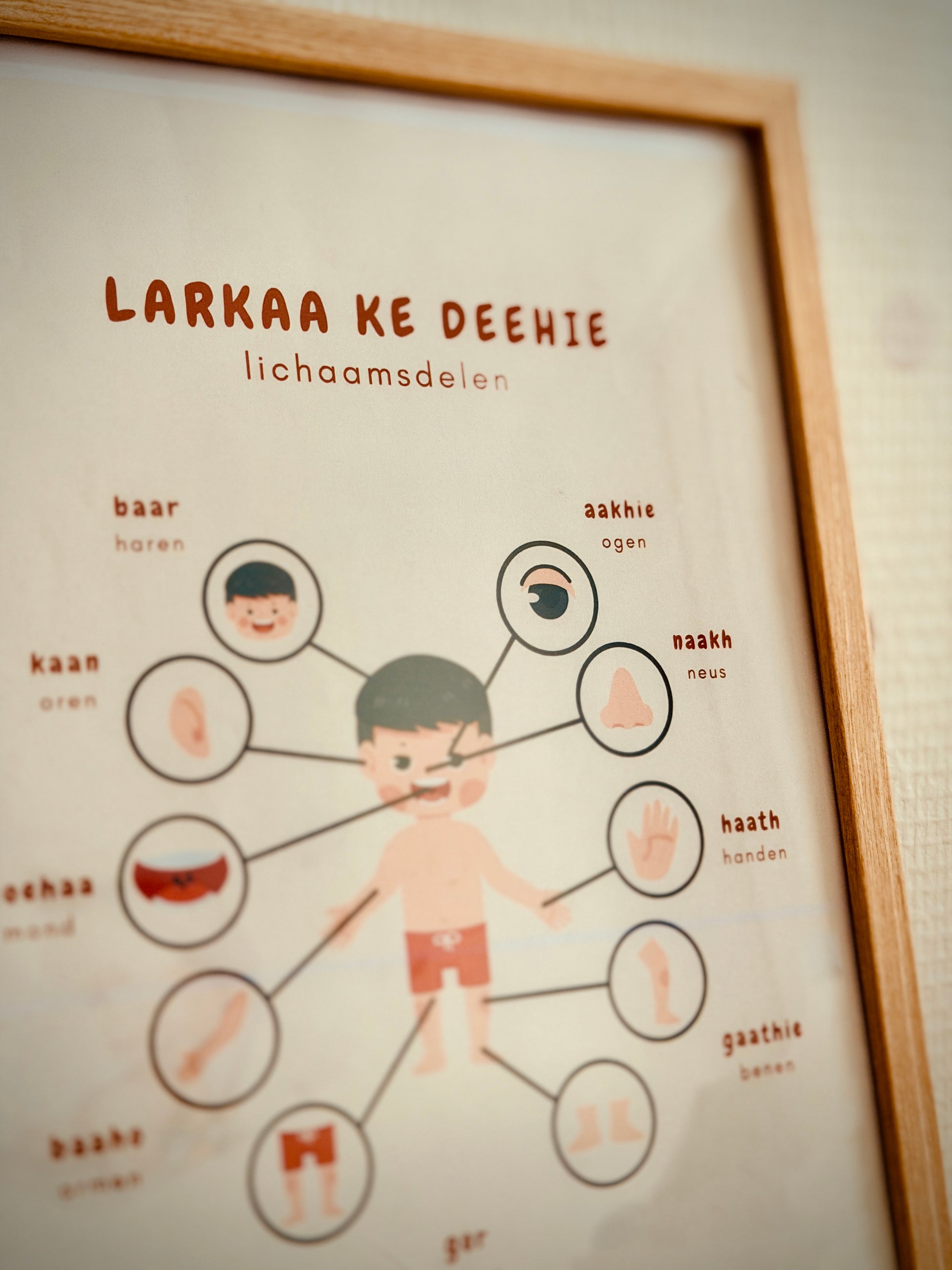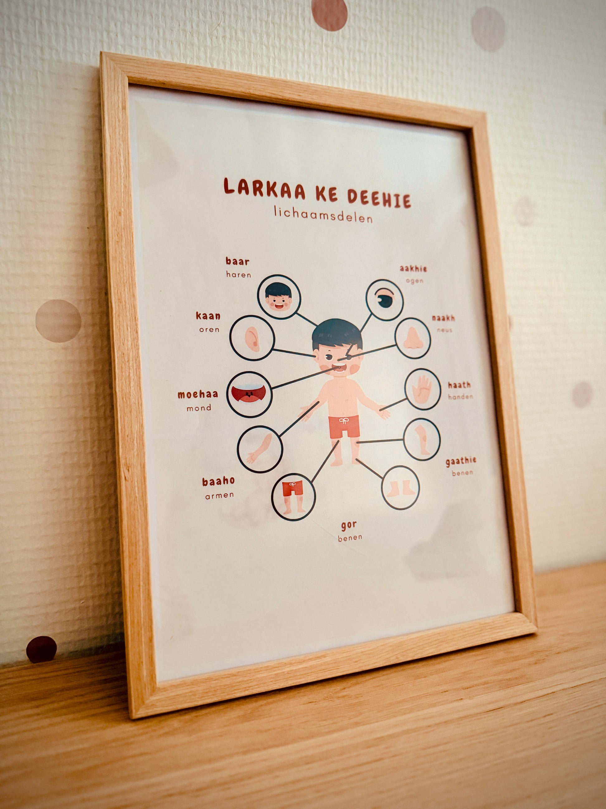 Ontdek het lichaam met onze A3 educatieve poster Lichaam van een jongen - Deehie (lichaam)! Deze kleurrijke poster laat het lichaam van een jongen zien, met de namen van de lichaamsdelen in Sarnami en Nederlands.