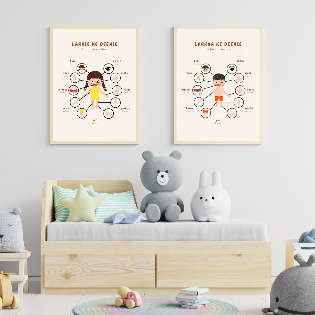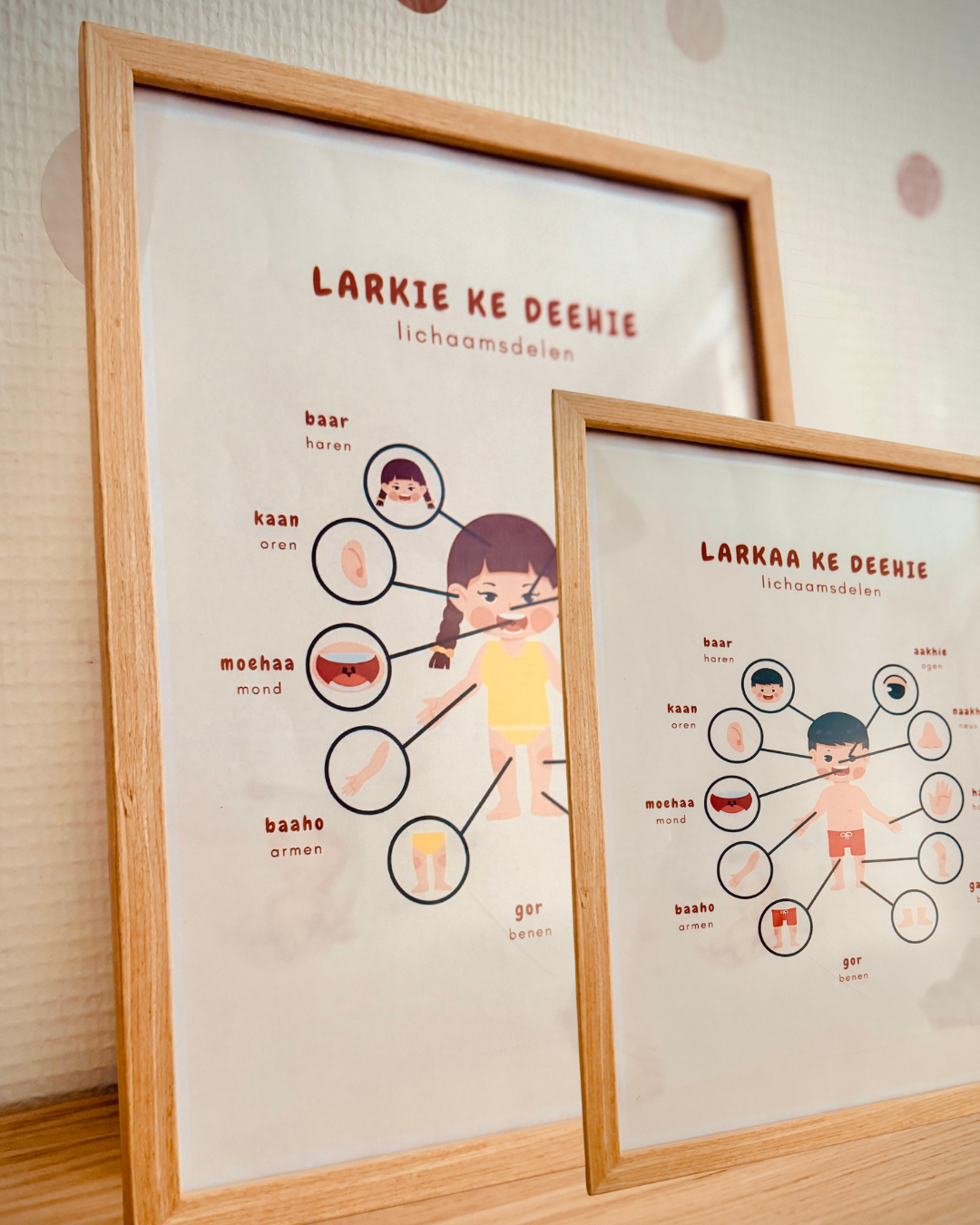 Ontdek het lichaam met onze A3 educatieve poster Het Lichaam van meisjes en jongens - Deehie (lichaam)! Deze kleurrijke poster laat zowel het lichaam van een meisje als van een jongen zien, met de namen van de lichaamsdelen in Sarnami en Nederlands.