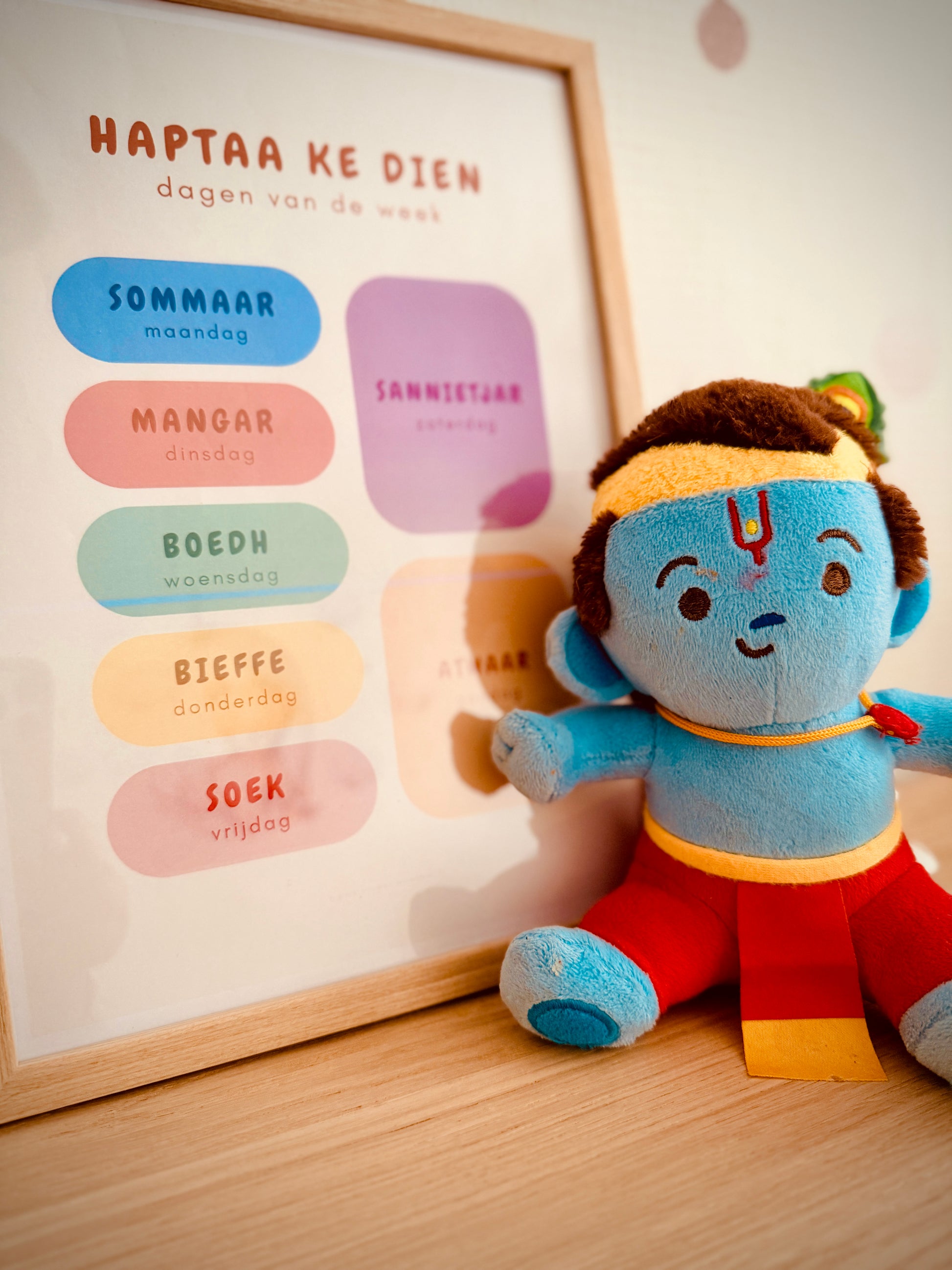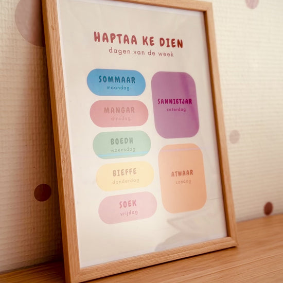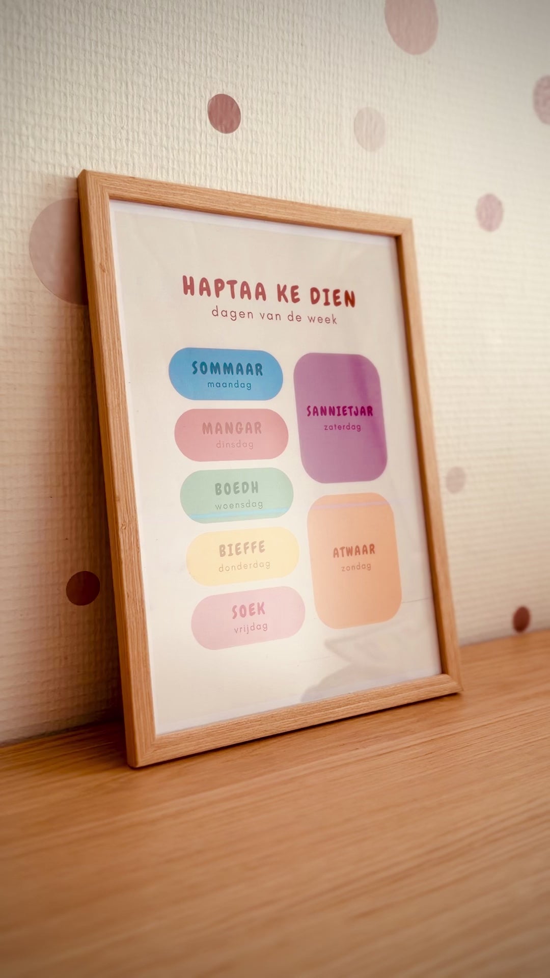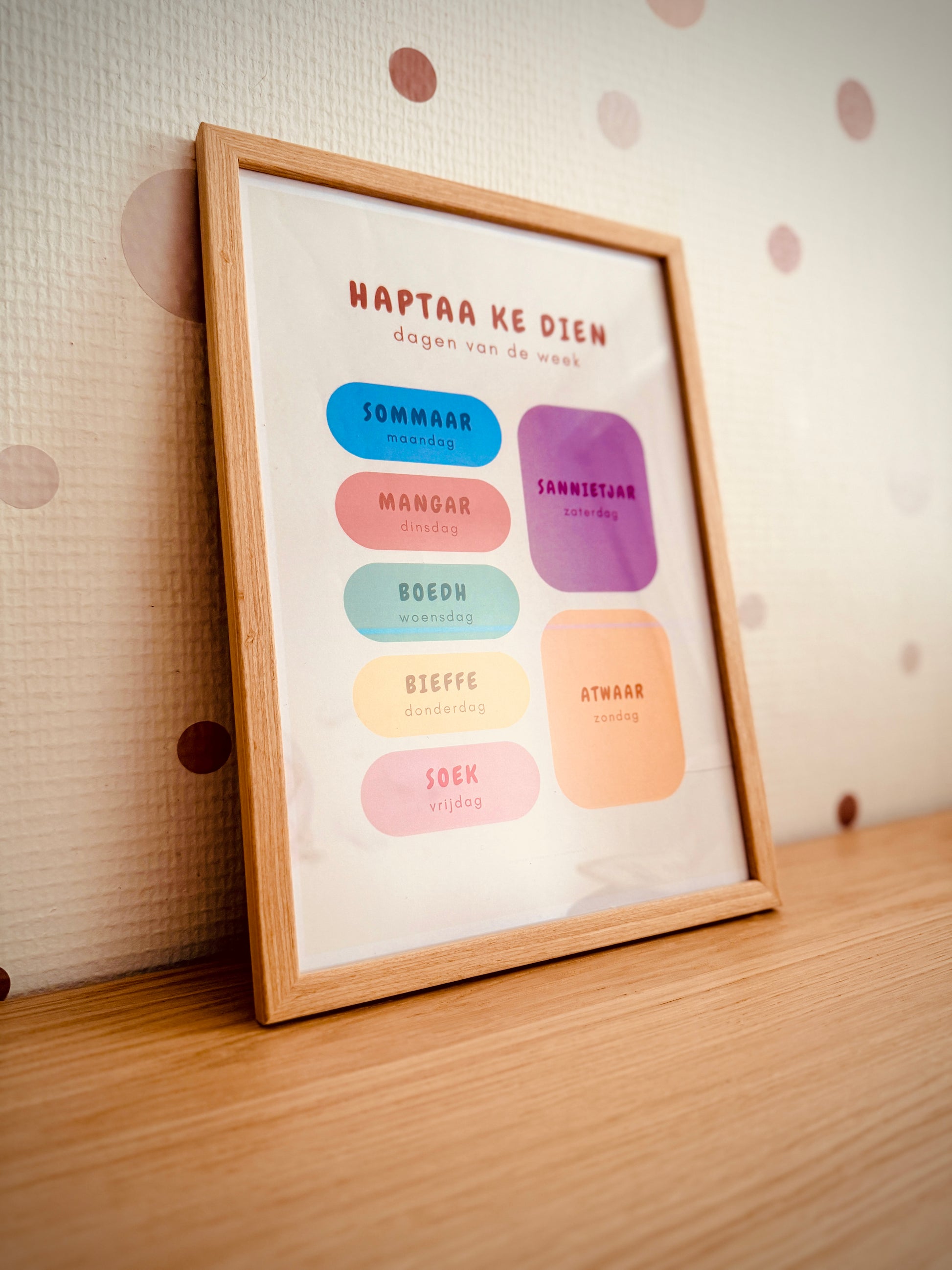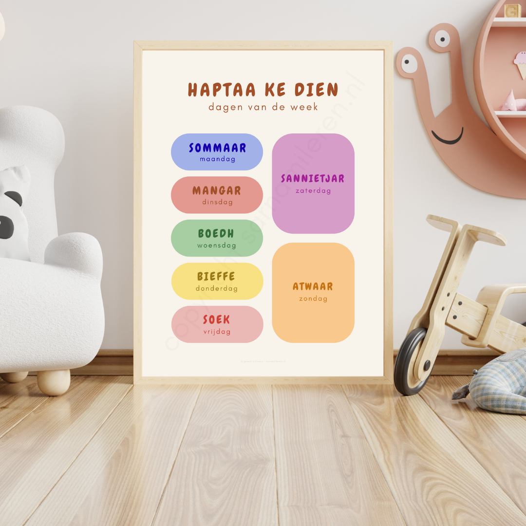 Ontdek de dagen van de week met onze A3 educatieve poster Dagen van de week - Haptaa ke Mahienaa! Deze kleurrijke poster laat alle 7 dagen overzichtelijk zien, met de namen in Sarnami en Nederlands.