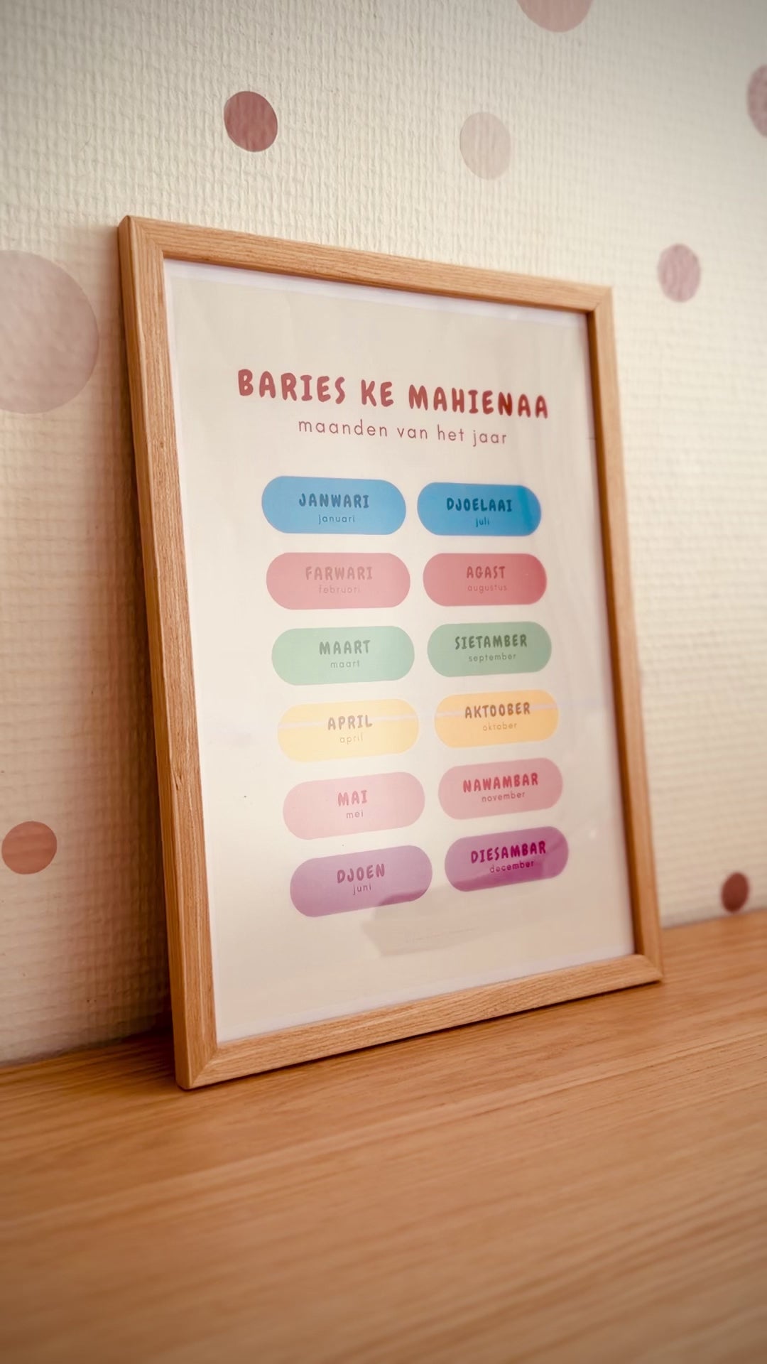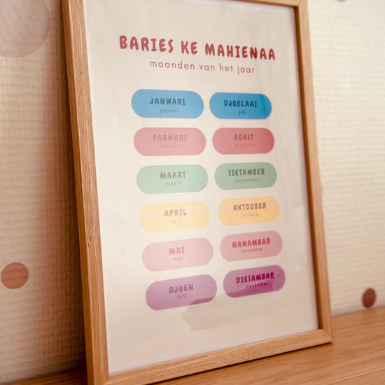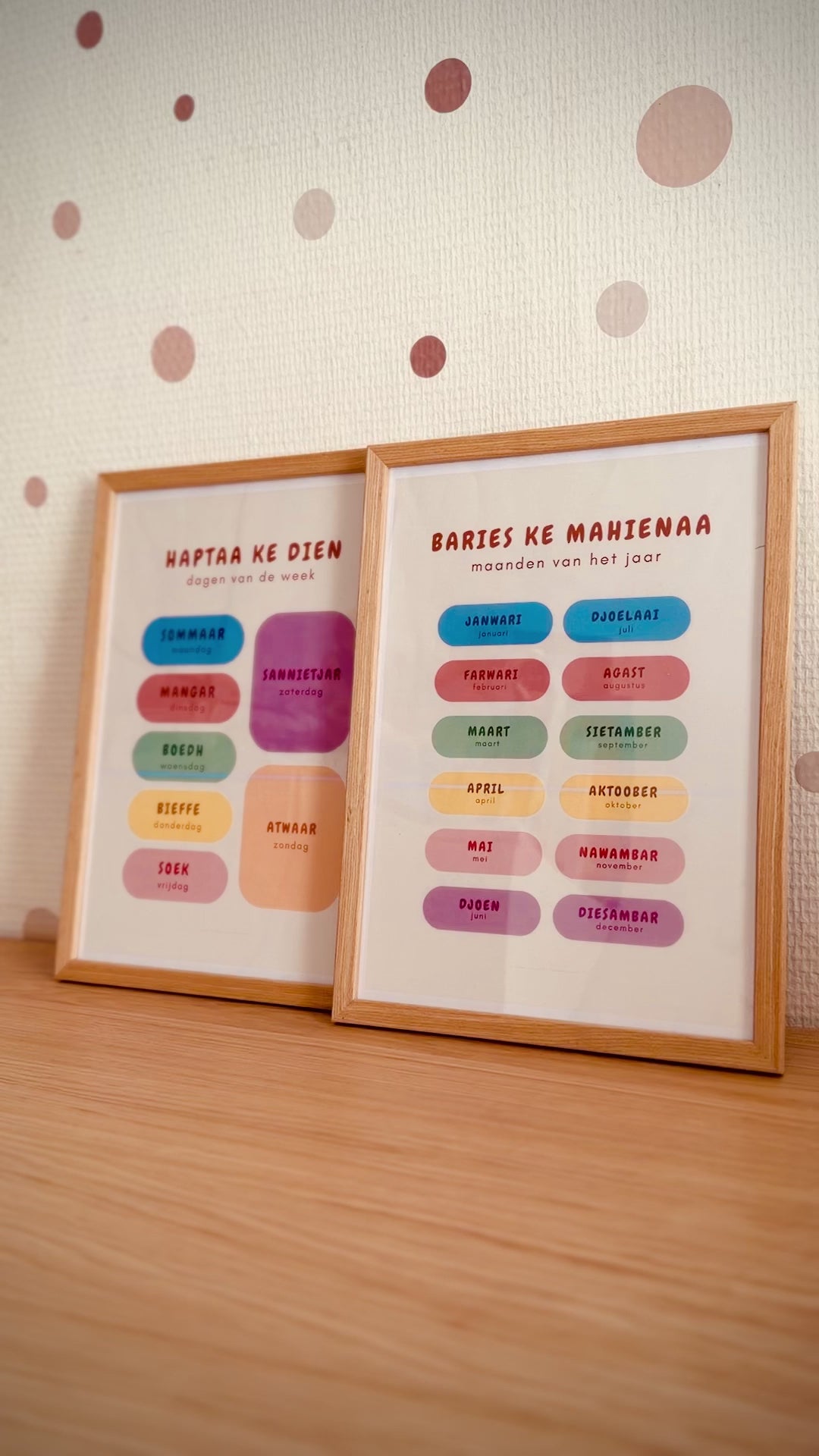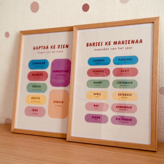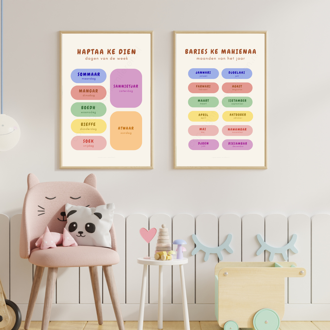 Ontdek de dagen van de week met onze A3 educatieve poster Dagen van de week - Haptaa ke Mahienaa! Deze kleurrijke poster laat alle 7 dagen overzichtelijk zien, met de namen in Sarnami en Nederlands.