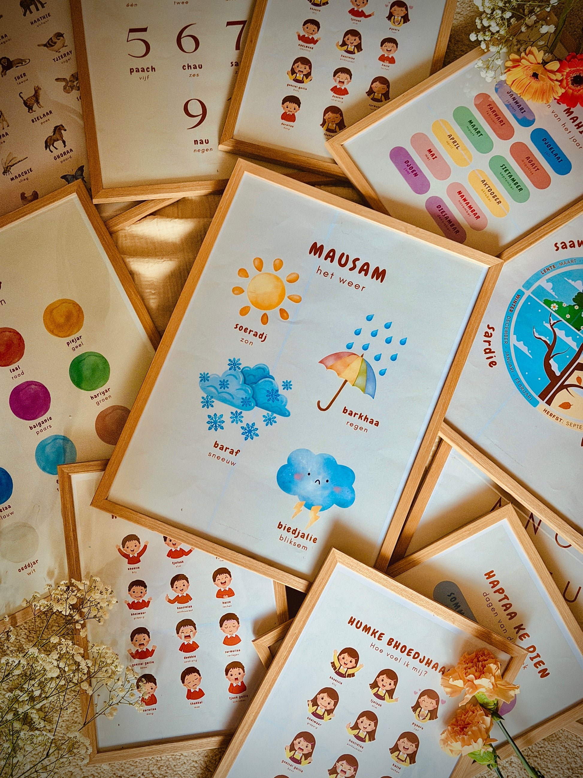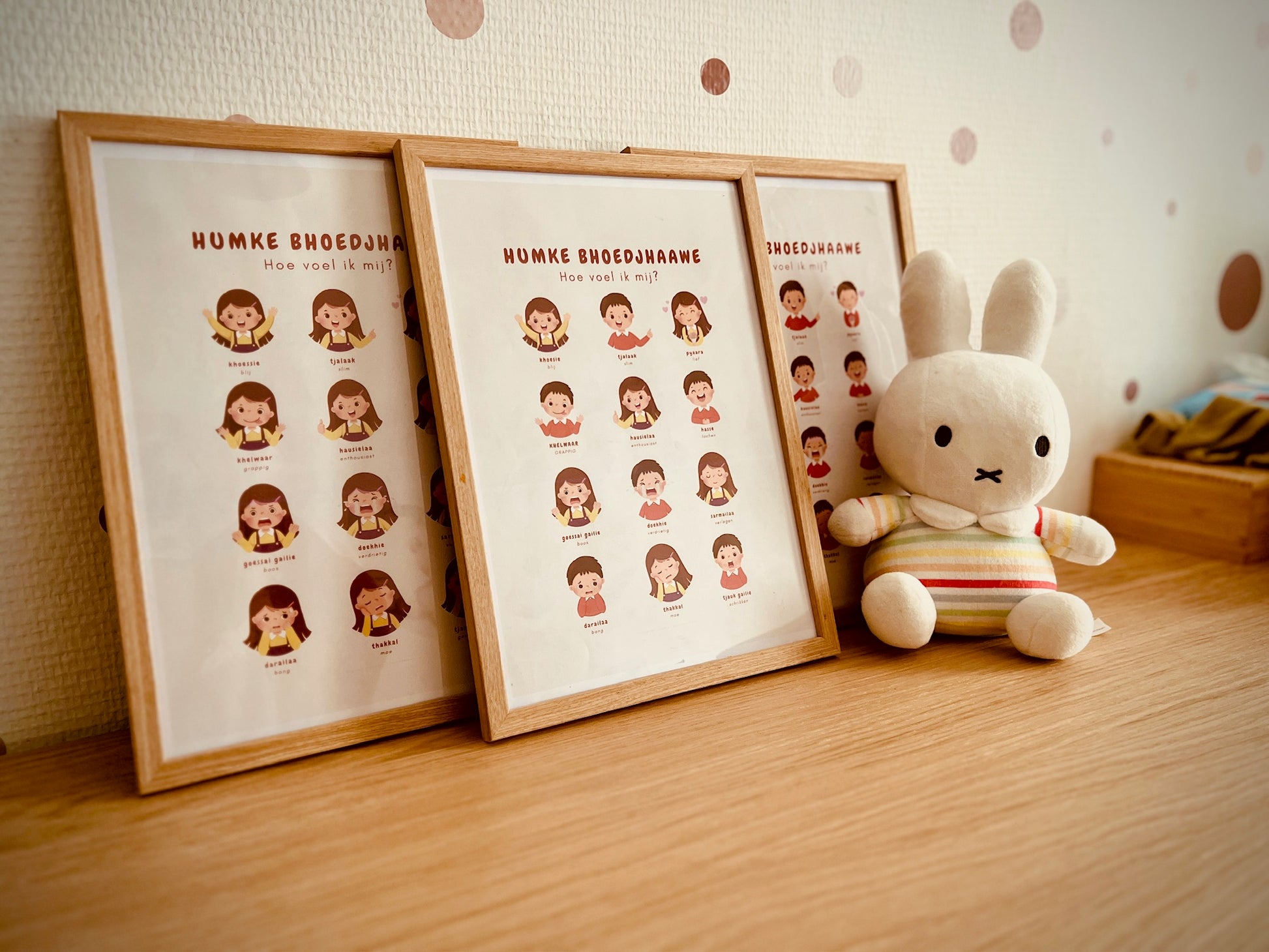 Deze kleurrijke poster laat 12 verschillende emoties zien met unieke illustraties van een meisje. Alle emoties zijn benoemd in zowel Sarnami als Nederlands.