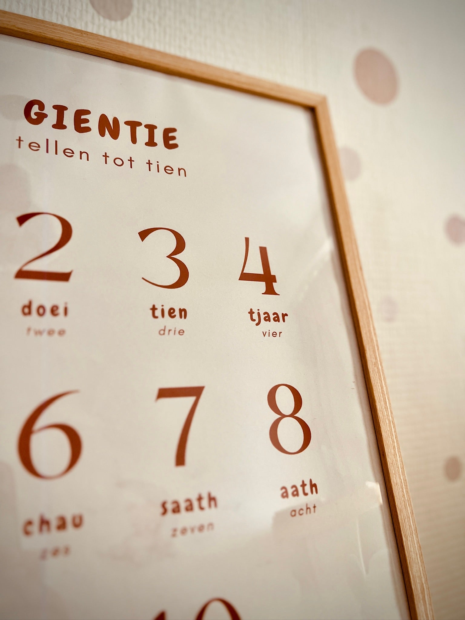 Deze kleurrijke poster laat de cijfers van 1 tot en met 10 zien, met de namen in zowel Sarnami als Nederlands.