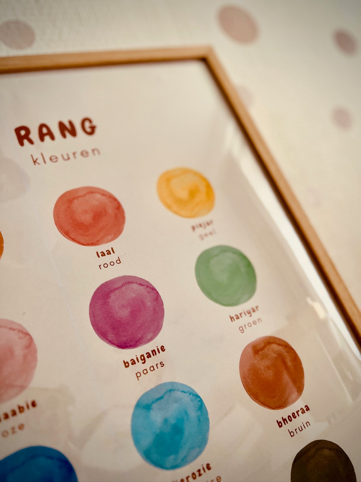 Deze prachtige, kleurrijke poster laat de belangrijkste kleuren zien, met de namen in Sarnami en Nederlands.
